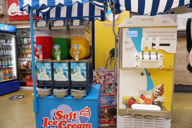 そこらじゅうにコーヒーの自販機が。全部1Lei (25円)