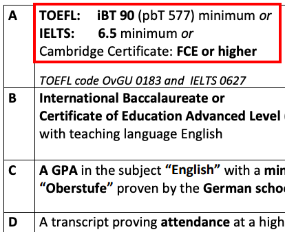 さんざん悩んだ末「ひとまずドイツ!」と決めた私は、あちらの大学の必要語学要件を確認してみることに。するとどこの学部も以下いずれかのスコアが必要と判明。