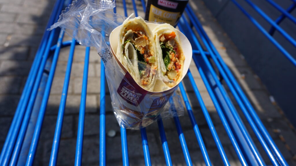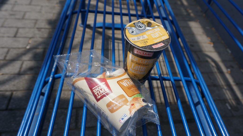 ALDIで買ったラテマキアートパック(日本のマウントレーニア的なやつ)と、なんかラップサンド