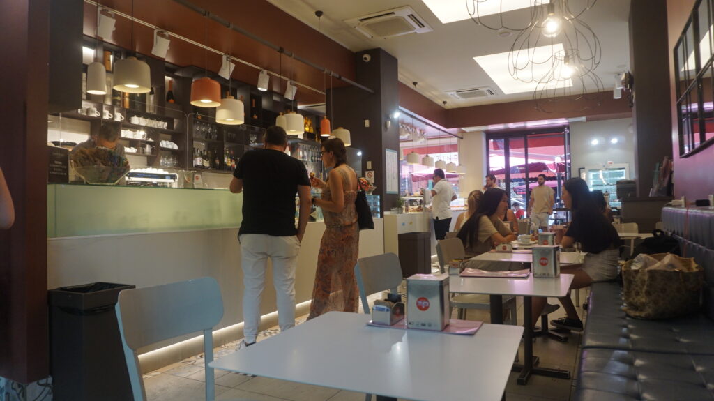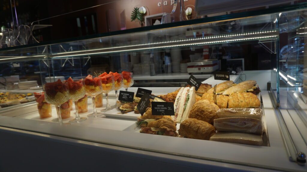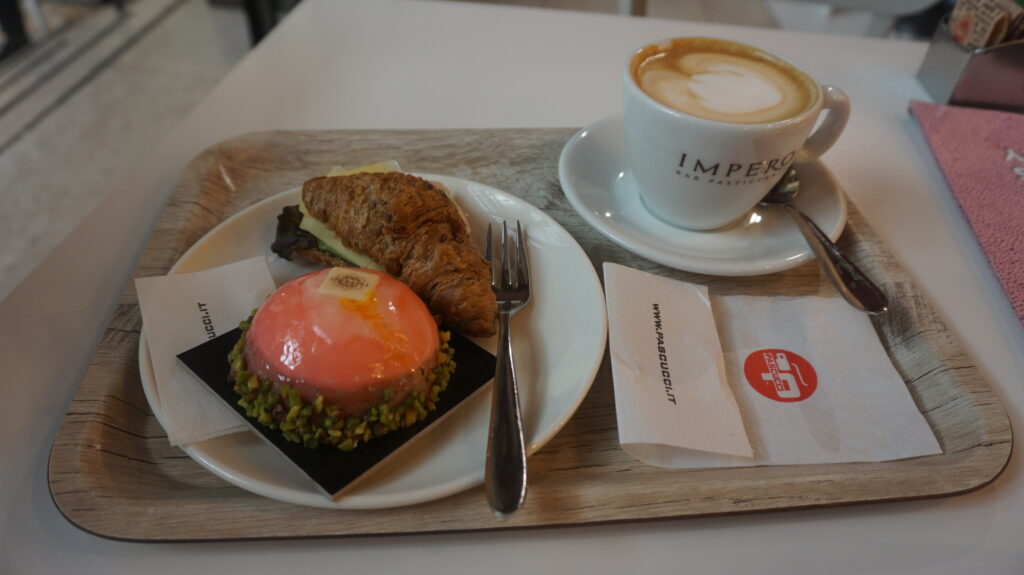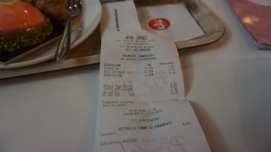 Cappuccino €1.6、 Mini Croissant salat €2、 Monoporzioni €5 合計 €8.6 (約1200円)