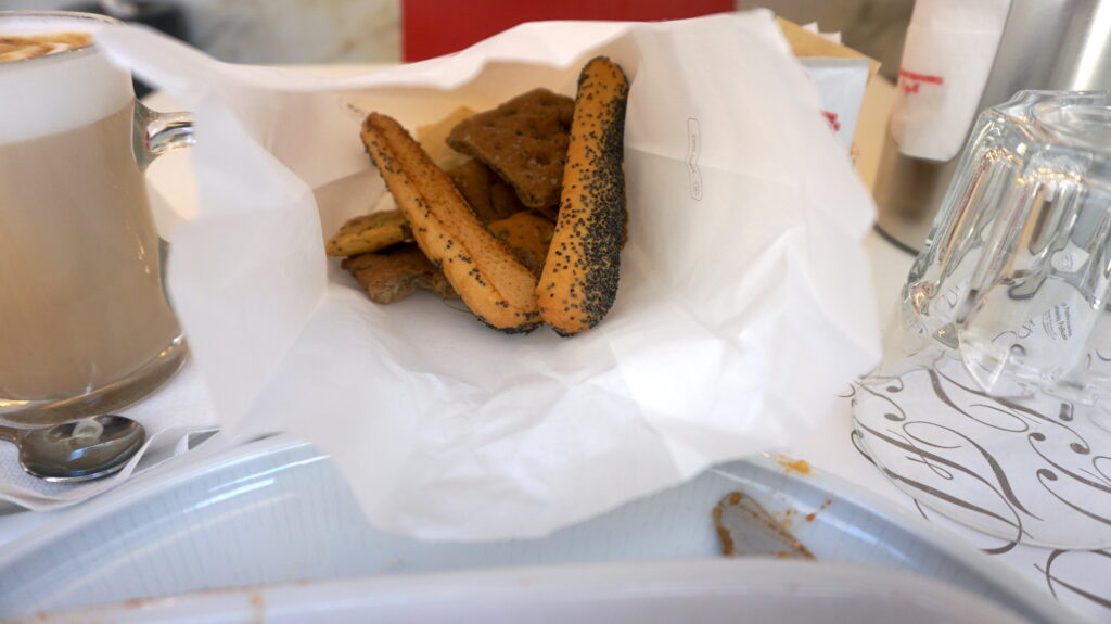 全然知らなかったんですが、こちらでは食事の時にグリッシーニやクラッカーが出るんですね。誰かの忘れ物かと思って焦りました。