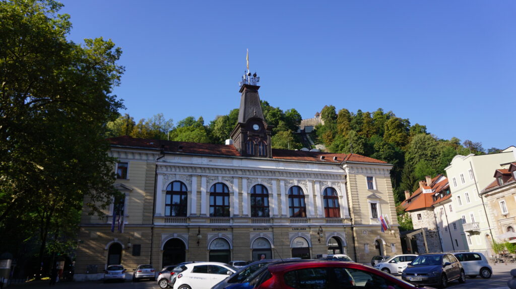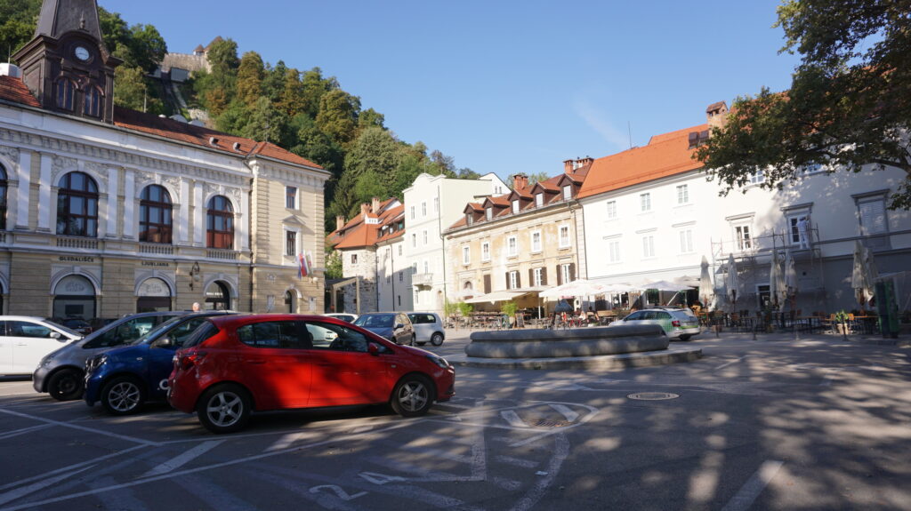 広場。すぐ裏にリュブリャナ城。ここから上がれるのかな?