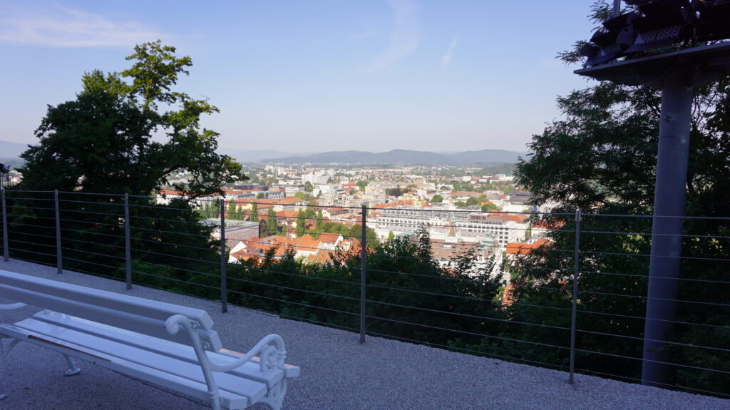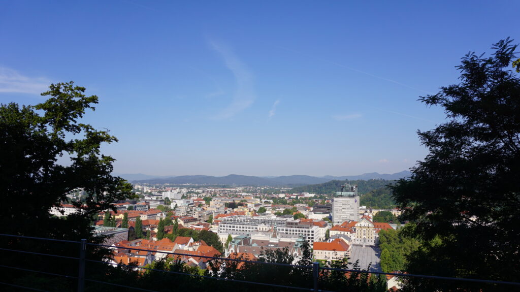 リュブリャナの景色を見ながら朝ごはん食べます。