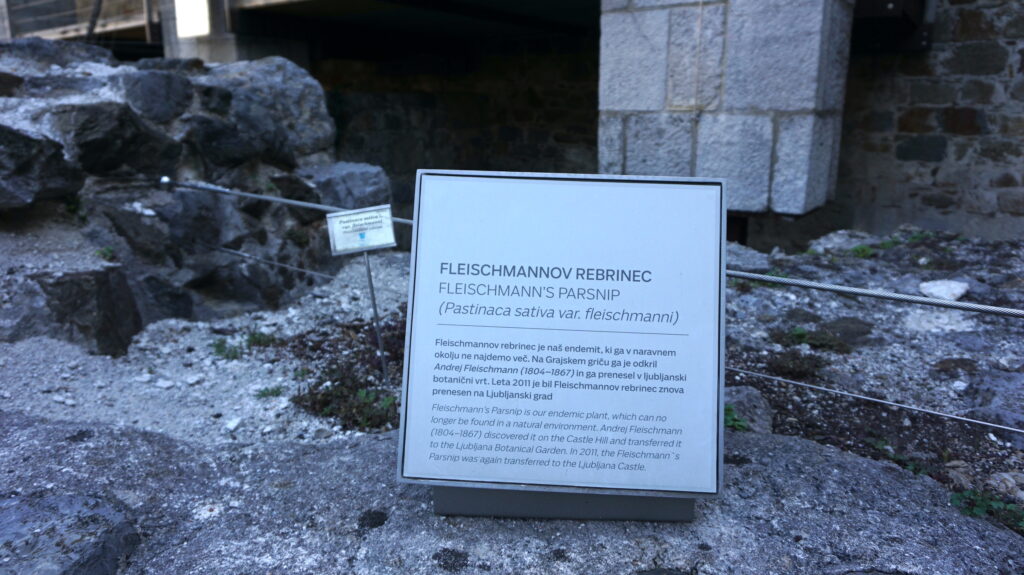 Fleischman’s Parsnip という植物で、野生では絶滅していたはずがなぜか19世紀になってお城に自生しているとわかり、植物園に移植されたのち、ここへ戻ってきたのだとか。