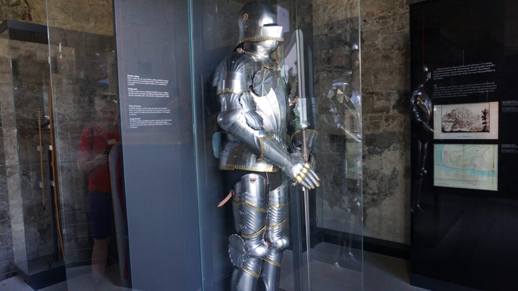 武器、武装コーナー。↑のような鎧を着られるのは位の高い騎士のみで、剣も騎士の象徴なんだとか。