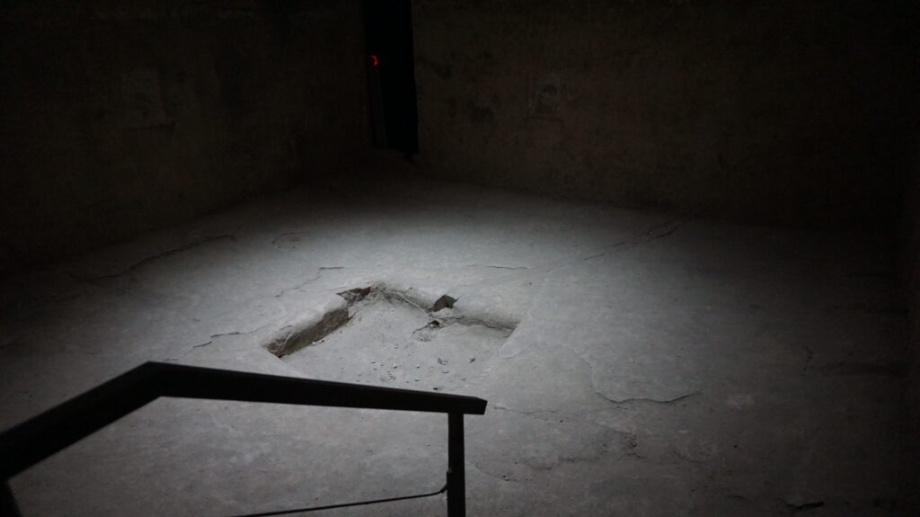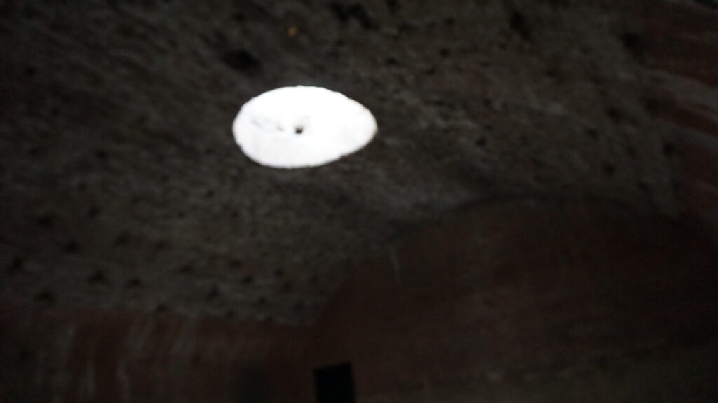 くらーい部屋に溝があいてるところがあって、天井には丸い穴が。雨水の貯水施設(cistern)だそうな。
