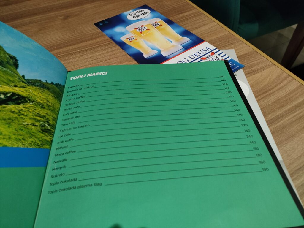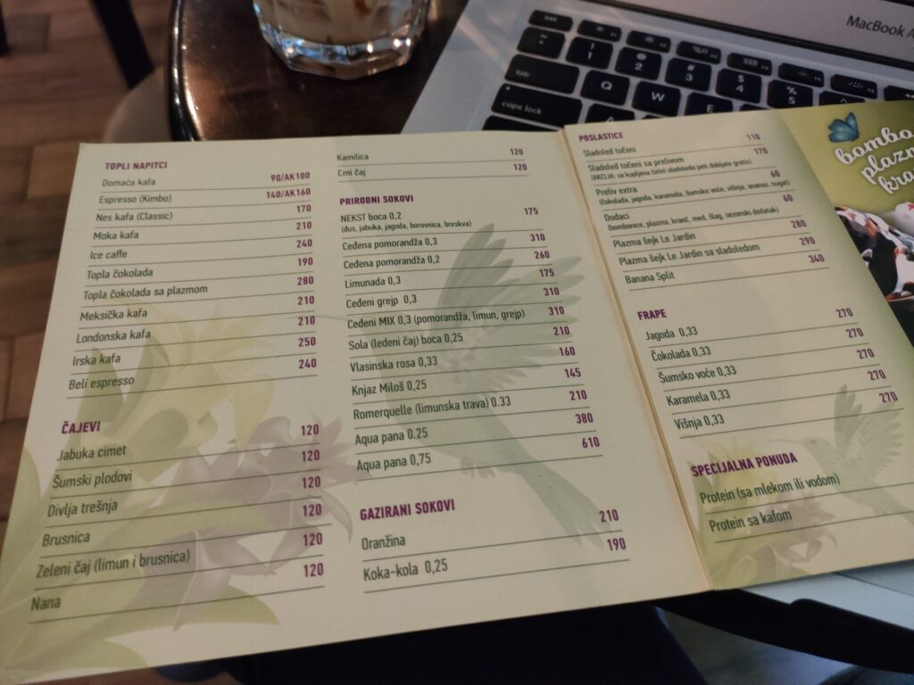 左下 Čajeviは紅茶類のことで、なんと一杯120din(160円)。コーヒーも200din〜250dinとお手頃。