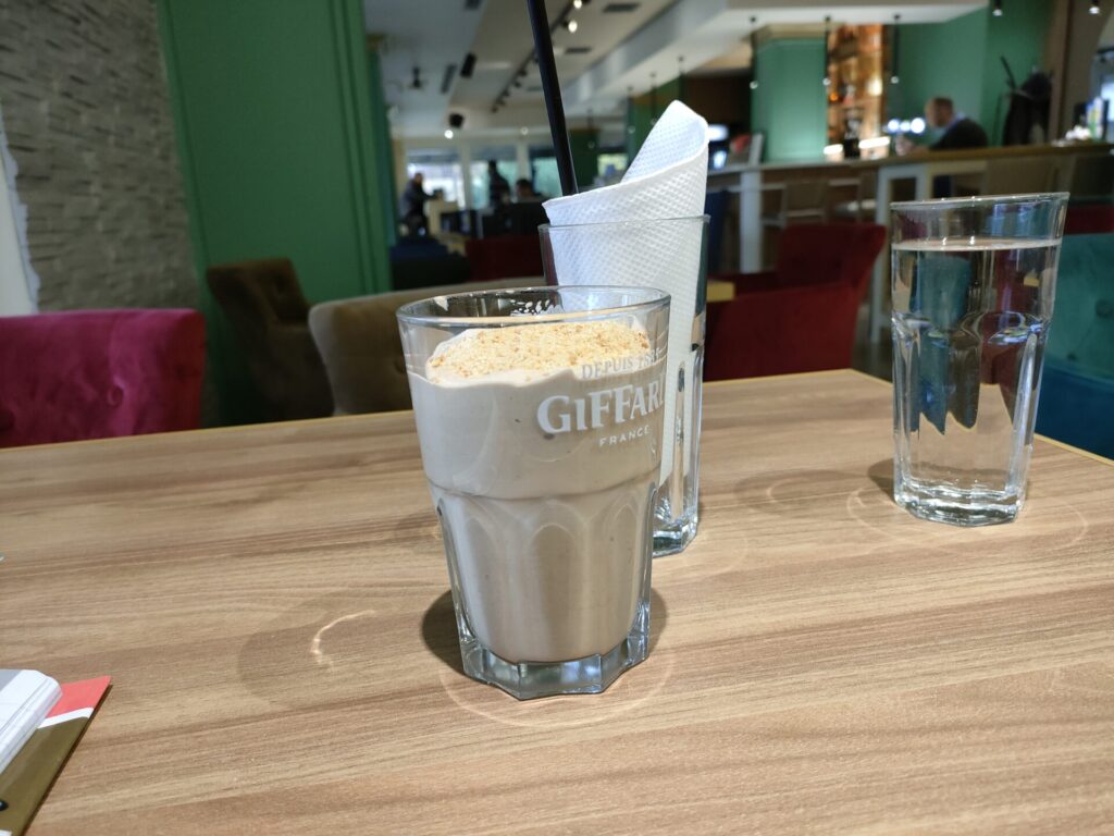 ホットチョコレート 160din(約200円)、カフェラテ160din(約200円)。やすい。