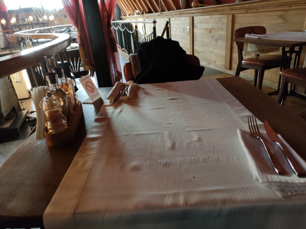 テーブルクロスかかってて、テーブルウェアがセットされている・・・。