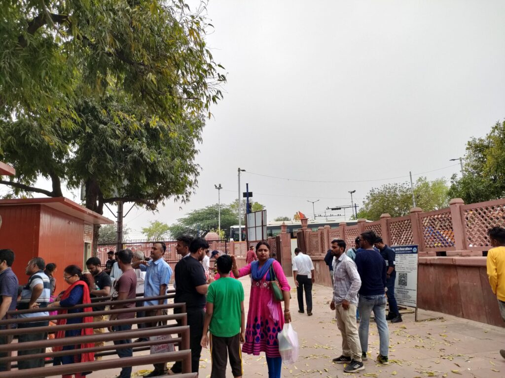 こちら、タージマハルに向かう参道的なところ。リキシャの客引きが大量にいて、ウマやラクダ(臭い)もいたりするけど、実は左にうつっている白いシャトルバスなら、外国人は無料で乗れちゃうのです!!プロガイドYさんのおかげでスムーズに乗車!