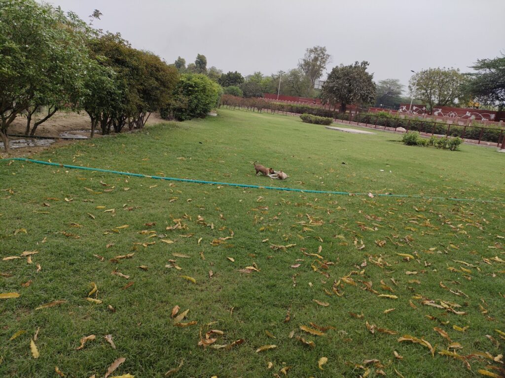 門の横の広場で野良犬の子供たちが戯れてた