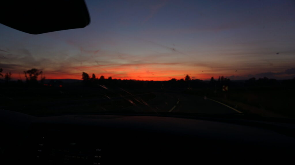 友人姉さんの車からみた燃えるような夕焼け。