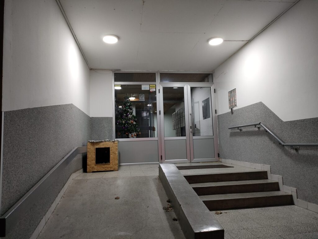 野良犬の為に作られた小屋が設置されているアパート。優しい。