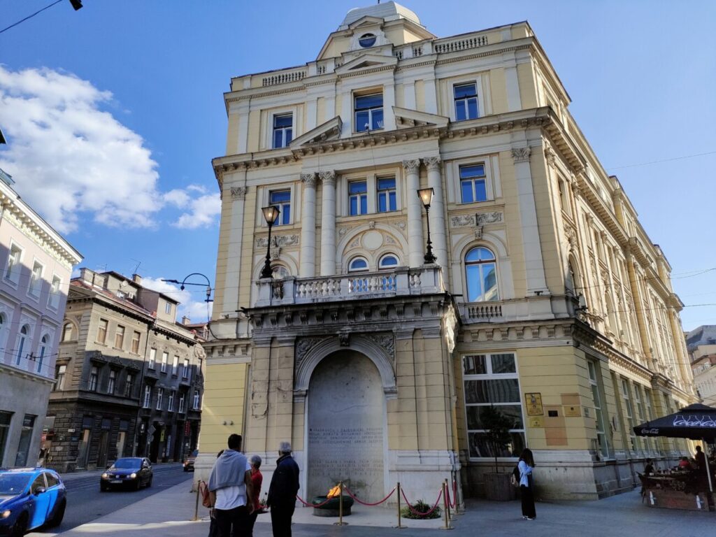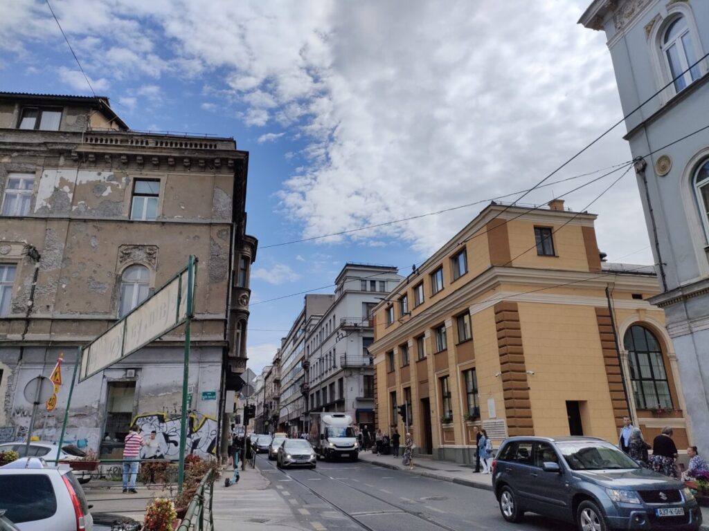 右側の素敵な建物はGradska tržnica Markale (マーケットホール)。ハンガリー帝国時代のネオルネッサンス建築。